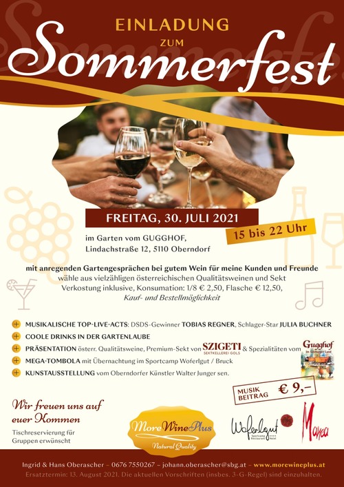 Nach dem großartigen Erfolg des letztjährigen Sommerfestes mit dem musikalischen Highlight von Mezzosopranistin Eva Schossleitner war ich heuer auf der Suche nach einer größeren Location. Mit dem Gugghof in Oberndorf kann ich euch diesmal einen traumhaften Garten samt großer Aussichtsterrasse mit Blick in Salzburgs Bergwelt bieten. Neben der Präsentation österreichischer Qualitätsweine von den Weingütern „Mayer der Wein“/NÖ, Lahrnsteig/Wachau, sowie Kiss, Mad und Esterházy aus dem Burgenland wird Peter Szigeti, Besitzer Österreichs einzigartiger Sektkellerei in Gols, persönlich anwesend sein und Szigeti-Premiumsekt servieren. Für musikalische Höhepunkte sorgen die Superstars Tobias REGNER, früherer Gewinner der deutschen Casting-Show „Deutschland sucht den Superstar“ und die aus vielen Musikshows und Fernsehauftritten international bekannte Schlagersängerin Julia BUCHNER. Weitere Highlights sind die Tombola mit dem Hauptpreis einer Übernachtung im Hotel/Sportcamp Woferlgut in Bruck/a.d.GlStr., eine Kunstausstellung vom Oberndorfer Künstler Walter Junger sen. und coole Cocktails in der Gartenlaube. Freitag, 13. August 2021 ab 15:00, Gugghof, Lindachstr. 12, 5110 Oberndorf. Bitte um Tischreservierung für Gruppen (+43 676 7550267, johann.oberascher@sbg.at). Die aktuellen Vorschriften (insbes. 3G-Regel) sind einzuhalten. Ersatztermin bei Schlechtwetter: 13. August 2021. Und natürlich kannst du deine Lieblingsweine gleich mitnehmen oder bestellen.