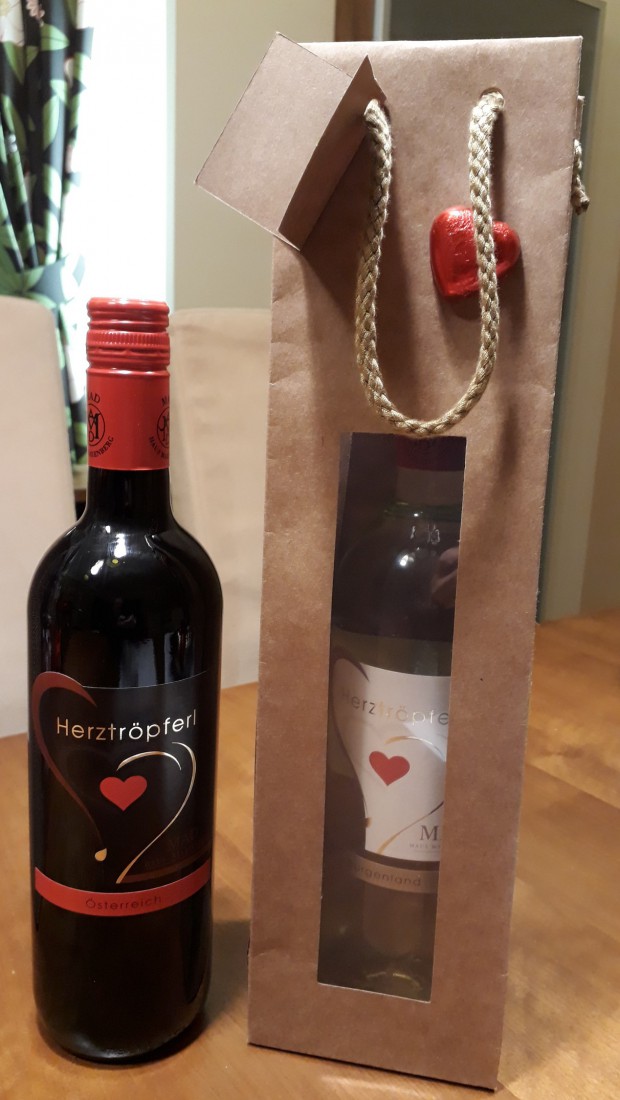 "Herztröpferl" lieblicher Rotwein Cuvèe oder Weißwein Auslese vom Weingut MAD im Burgenland in der praktischen Tragtasche