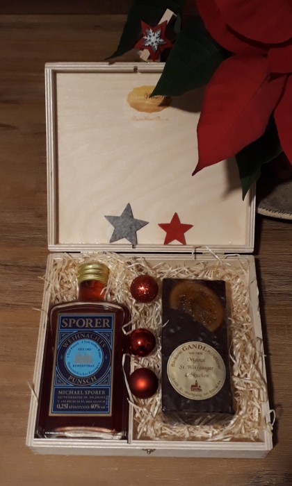 stabile Holzbox mit original Sporer Weihnachtspunsch 0,25 l (1:4) und original St. Wolfganger Schoko-Lebkuchen von Gandl