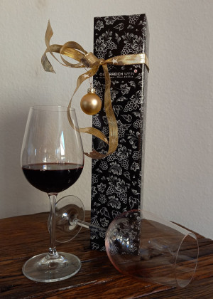 weihnachtlicher Geschenkkarton mit zwei Flaschen Qualitätswein 0,75 l vom Weingut Kiss/Burgenland